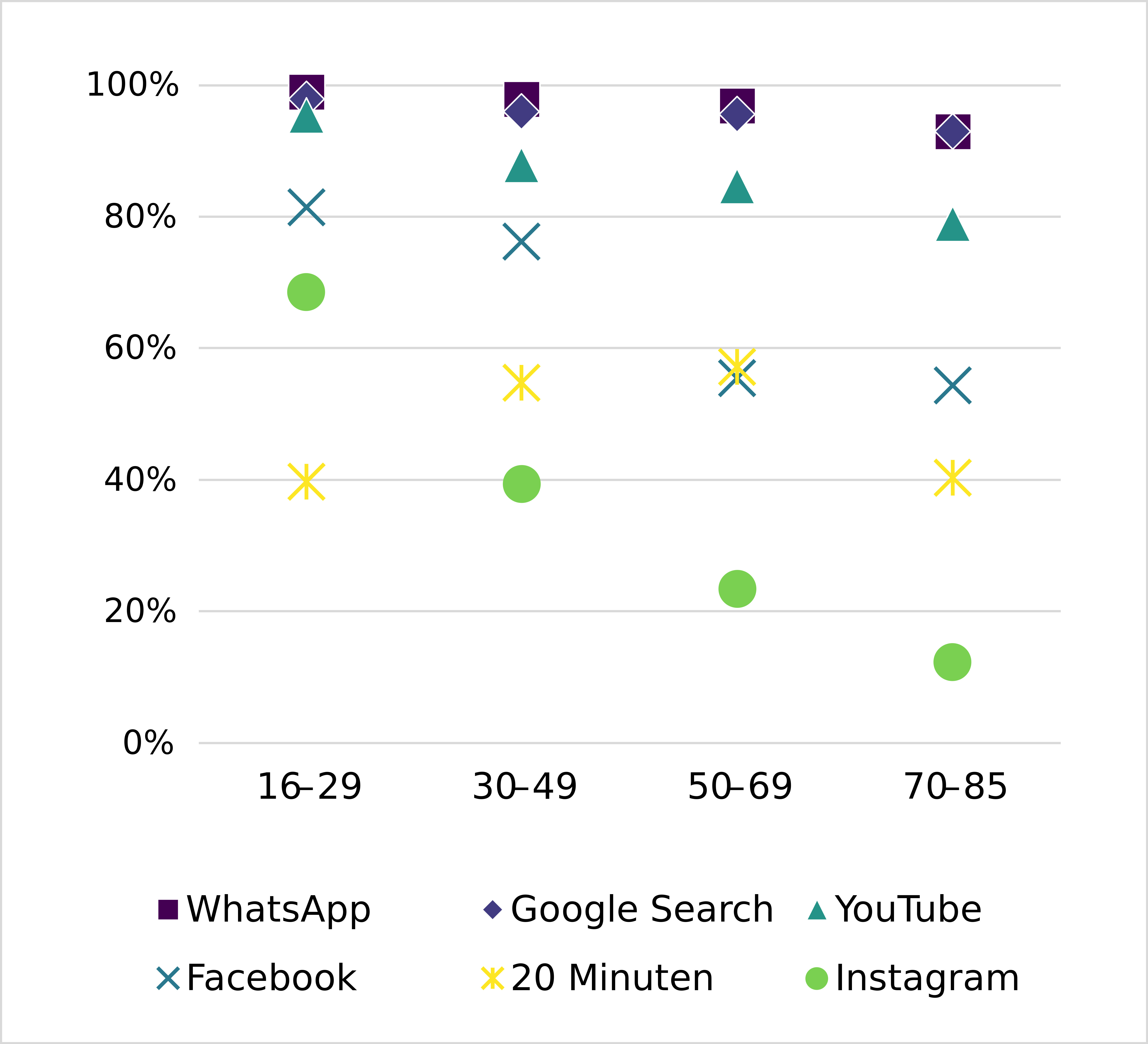 How many people of what ages even use these popular services? Younger people are more likely to use social media services. Only news (20 Minuten) had the highest user percentage among middle aged people.