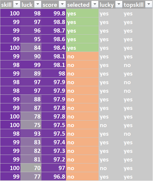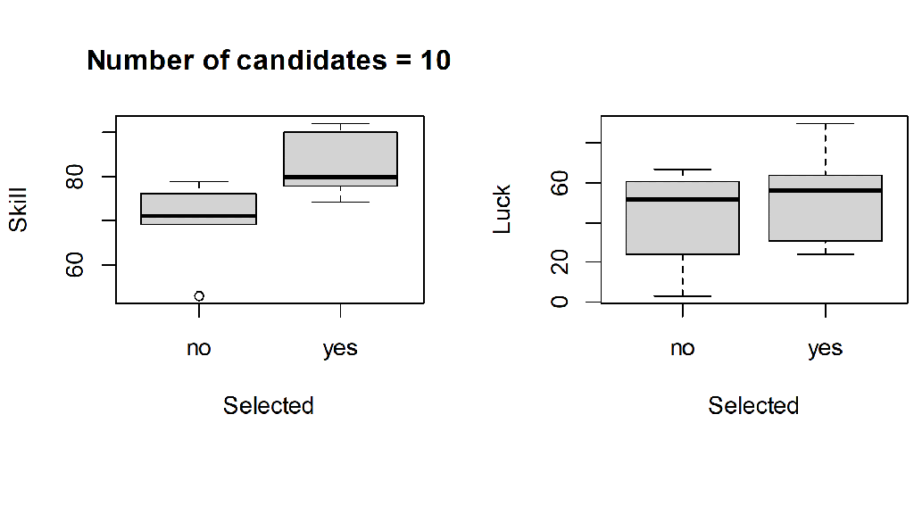 Assuming now that there are 5 jobs available, I’ll call those “selected” and compare their skills and luck to those of the candidates not selected.