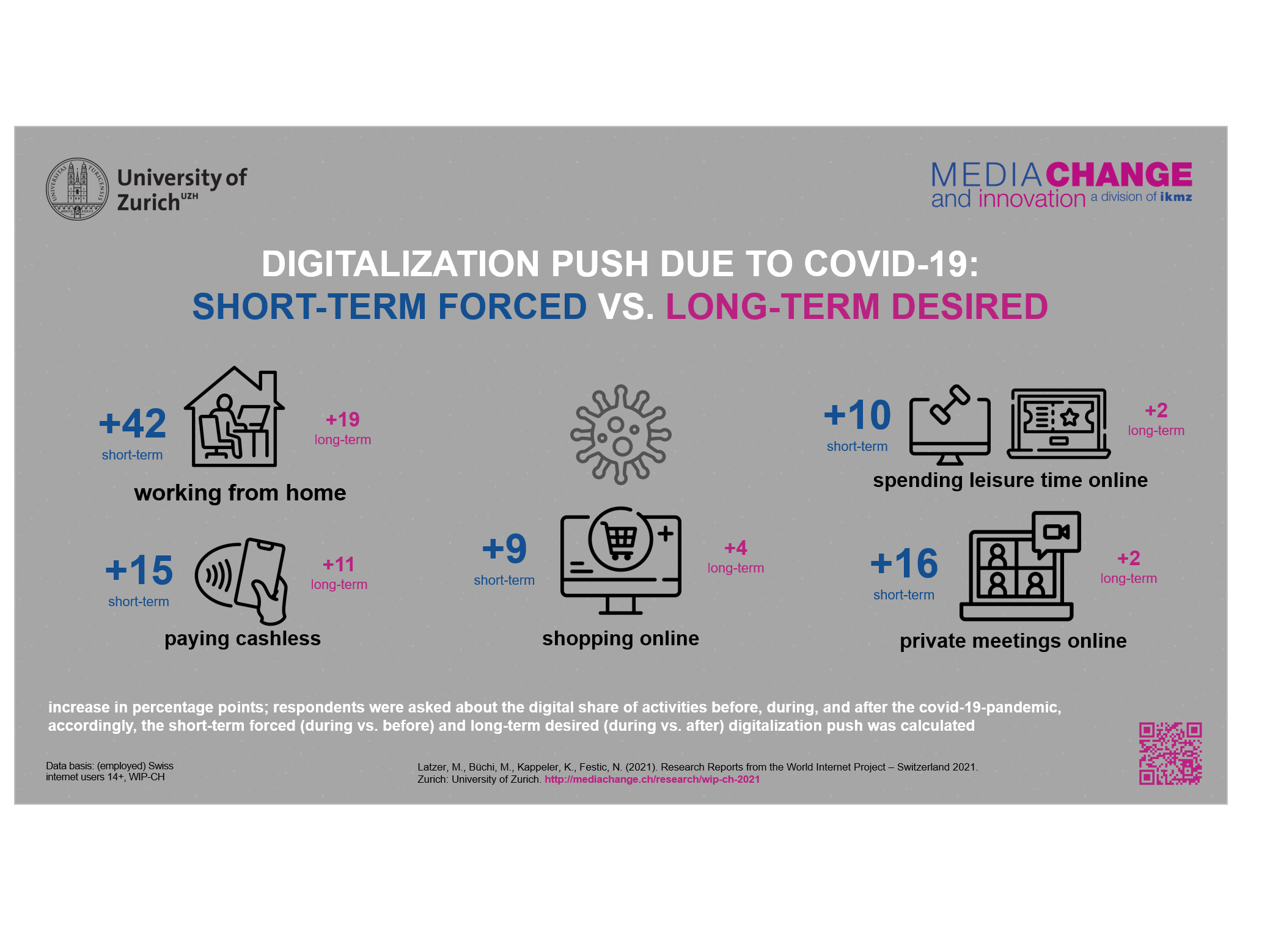 The Covid-19 pandemic has accelerated the digitization of everyday life. Especially when it comes to working and shopping, Swiss people want to see most of these changes remain in the long run. These are results of the World Internet Project – Switzerland 2021. Due to the Covid-19 pandemic, everyday life in Switzerland has been severely restricted since March 2020 and many activities have increasingly shifted to digital spaces. This forced digitization push is most pronounced in the area of remote working: Whereas before the pandemic, employed internet users spent just under 20 percent of their employed hours working from home, during the pandemic it was more than 60 percent. Post-pandemic, they wish to work from home about two days of the week.