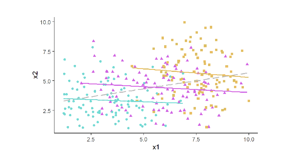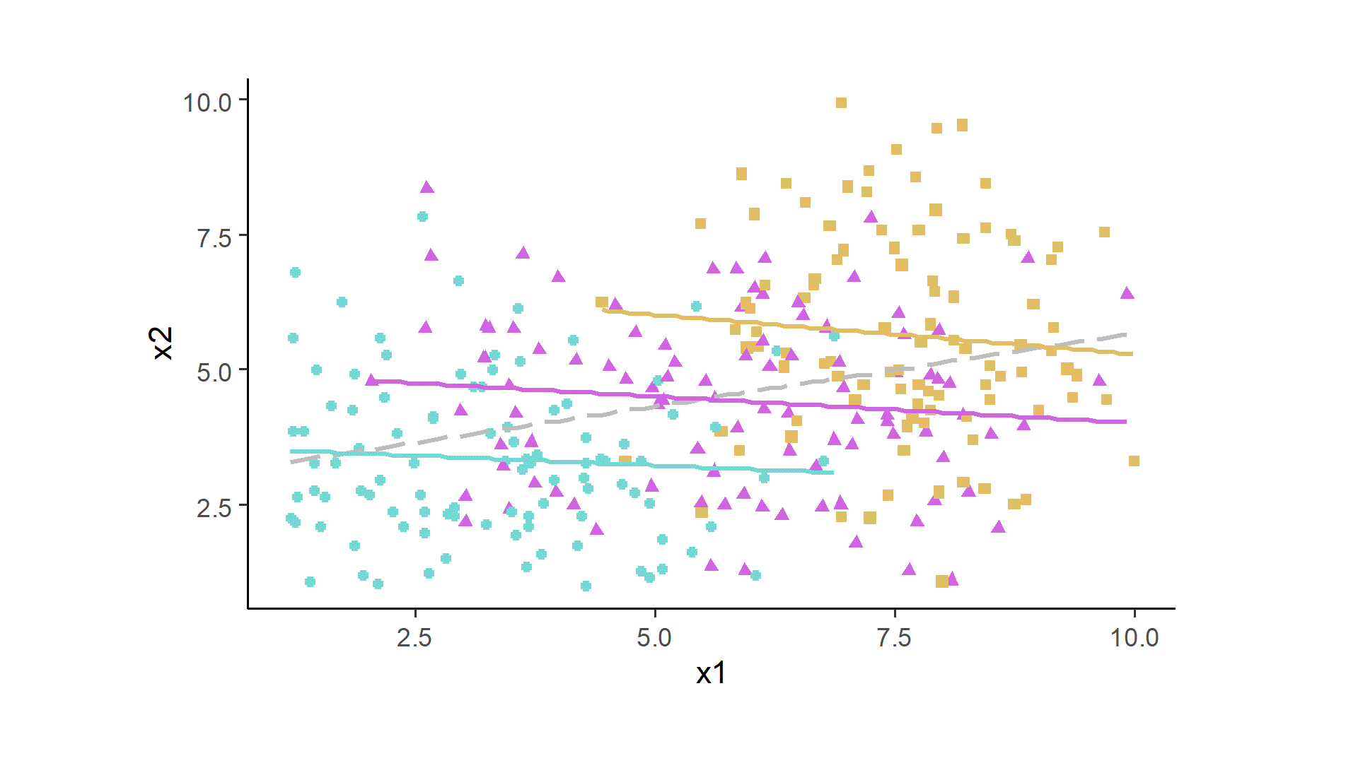 After some data prep and ggplot2 code, we can look at the data in this way. The gray dashed line indicates the global fit. Each person now is assigned a color and a shape, and gets their own fit line. The whole simulation can be run many times, and sometimes all three colored lines will be positive, or all of them negative, or a mixture.