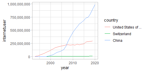 This data on media technology adoption basically only has absolute numbers for a lot of years and a lot of countries, but it is difficult to compare across countries since we don’t have the population sizes yet. For example, comparing the number of internet users across Switzerland, the United States, and China, we can’t see that the adoption is in fact highest in Switzerland: