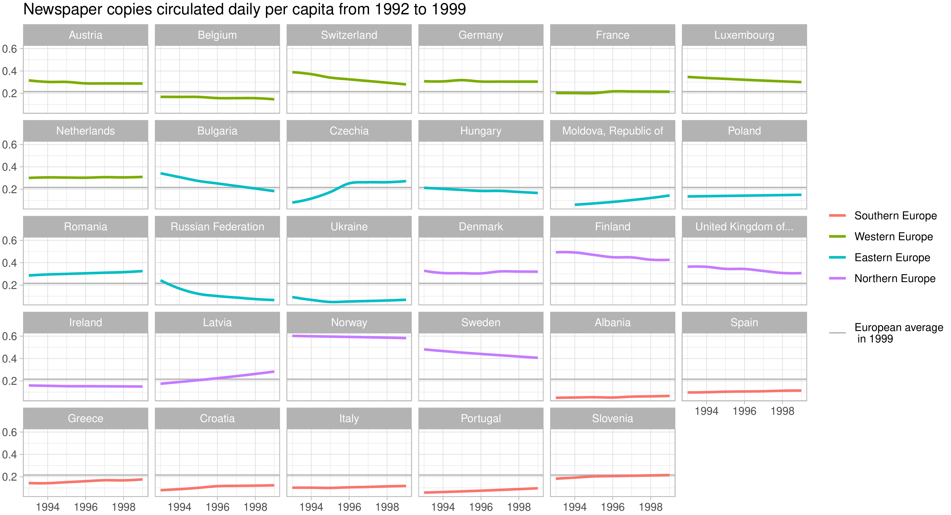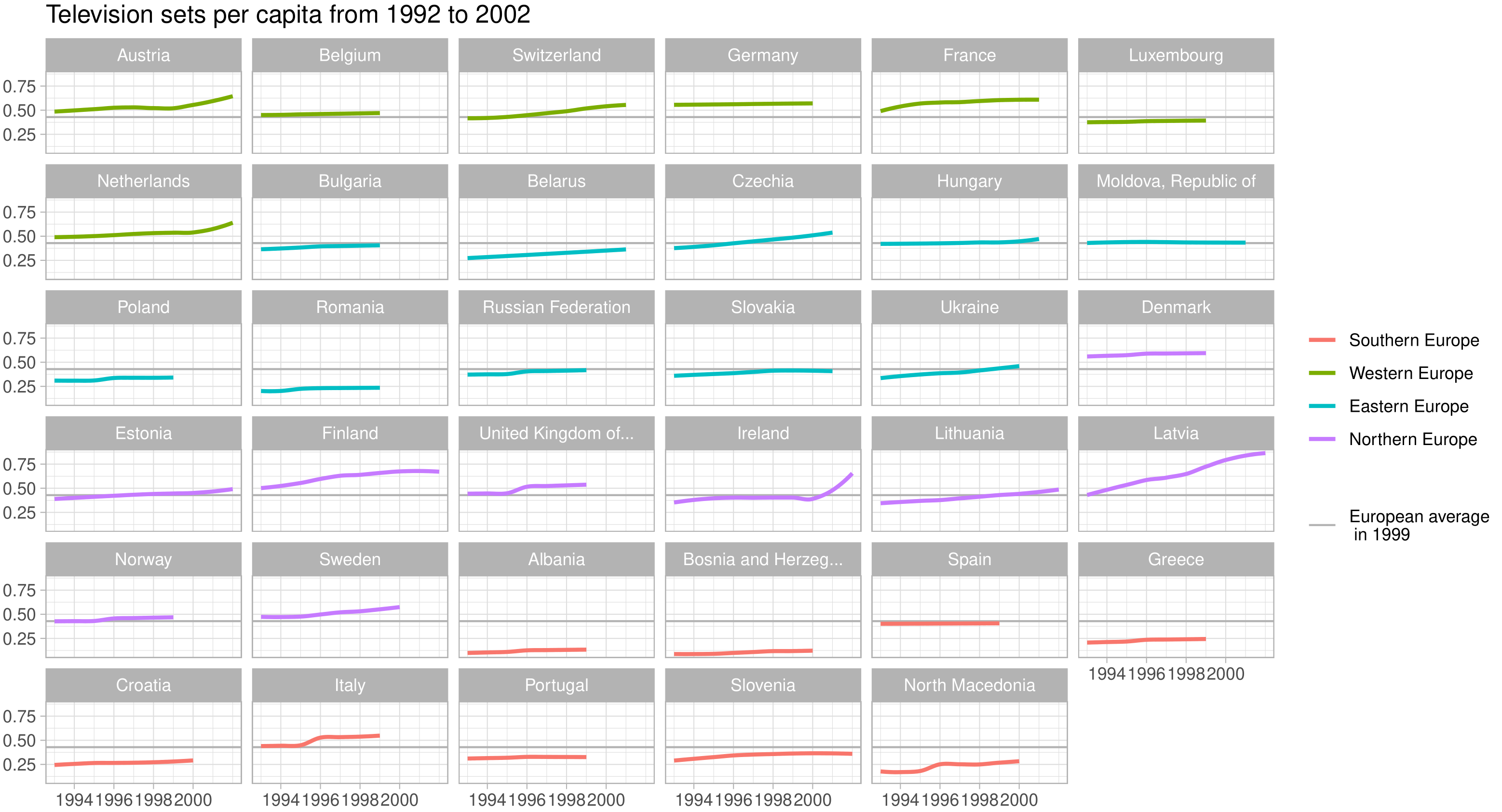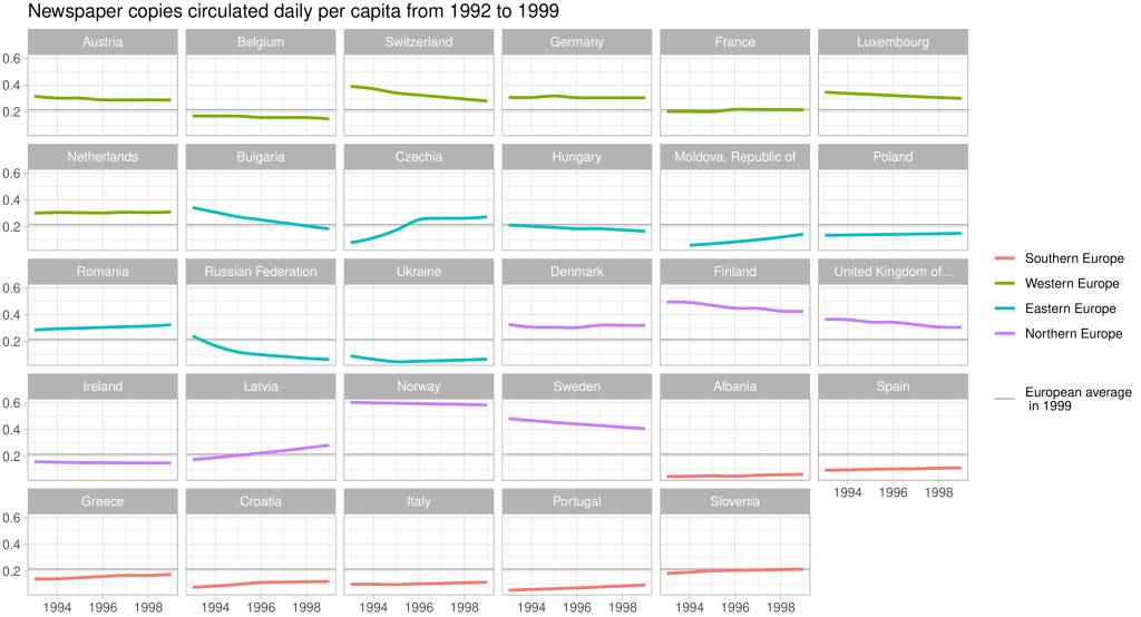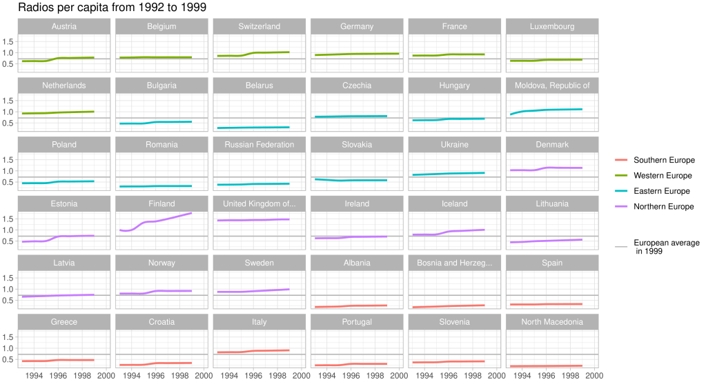 First, we’ll create a separate data frame for ease of use, filtering for European countries, and precalculate the average levels (later used as reference lines) of the four media technologies in the last year they were measured for a good chunk of the countries: