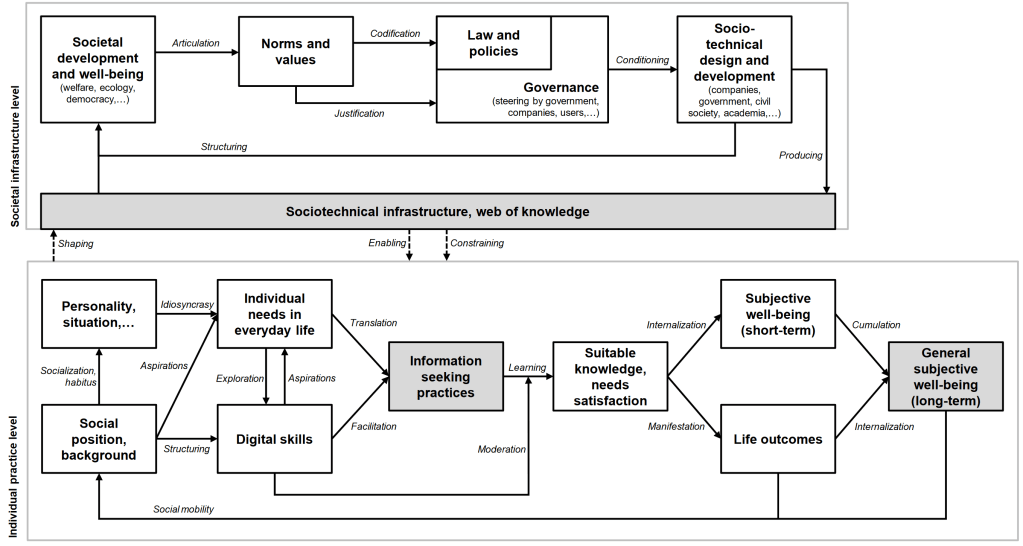 No. But access to knowledge has changed a lot since the 1990s. Ubiquitous digital media means people have developed new default ways of searching for information in everyday life, and there is a lack of research on the structure and outcomes of this change. Successfully fulfilling these mundane knowledge needs can impact subjective well-being and life outcomes, especially in transitional phases such as emerging adulthood. Success, i.e., finding what you need and want, depends on you / the demand (individual level) AND on what is out there in the “digital knowledge infrastructure” / the supply (infrastructure level). The resulting model accordingly has a micro level with various mechanisms that shape how digital information seeking arises and impacts well-being; and a macro level process of the governance of socio-technical infrastructure.